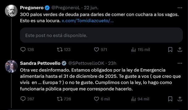 Lejos de preocuparse por los términos de Pregonero, la ministra respondió: "Otra vez desinformado. Estamos obligados por la ley de Emergencia alimentaria hasta el 31 de diciembre de 2025. Te guste a vos (que creo que vivís en ... Europa?) o no te guste. Cumplimos con la ley, lo hago como funcionaria pública porque me corresponde hacerlo".