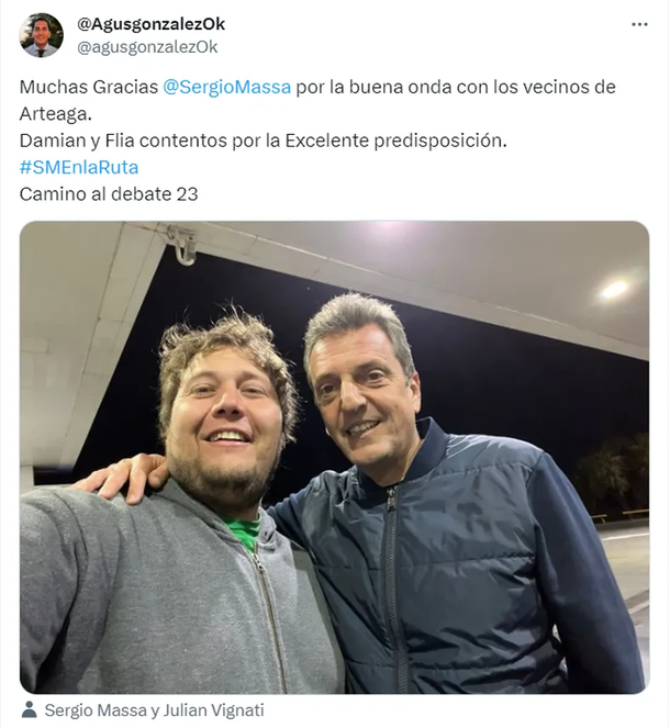 Incluso, a lo largo de su viaje, el candidato presidencial realizó diferentes paradas técnicas en las que se cruzó con miliantes. Algunos subieron fotos a sus redes junto y uno de ellos fue el intendente de la localidad cordobesa Cruz Alta, que compartió una foto junto a Massa en la red social X y escribió: "Muchas gracias Sergio Massa por la buena onda con los vecinos de Arteaga".