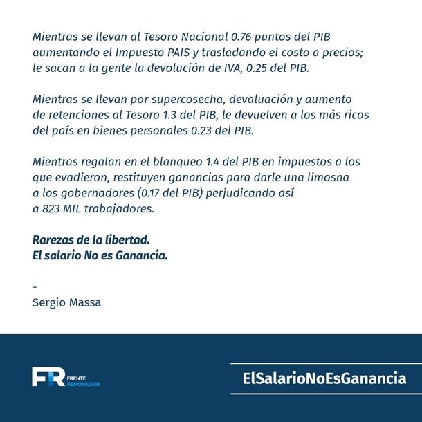 "Rarezas de la libertad. El salario no es ganancia", es el corolario del mensaje publicado este martes por el exministro de Economía Sergio Massa a través de las redes sociales del Frente Renovador, su espacio político al que se retrotrajo una vez finalizado su rol en el Gobierno de Alberto Fernández.