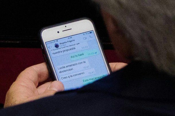 Mientras se debatía el proyecto sobre tarifas, alguien desde un palco del recinto fotografió el teléfono de Pinedo y capturó un chat con Frigerio en el que el ministro le aconsejaba "mandar al frente a Pichetto como autor" del proyecto alternativo que presentó Cambiemos.
