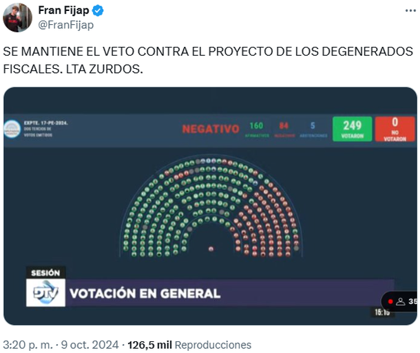 Antes de los incidentes en el Congreso, el influencer libertario Fran Fijap celebró el resultado en Diputados: "Se mantiene el veto contra el proyecto de los degenerados fiscales. LTA zurdos".