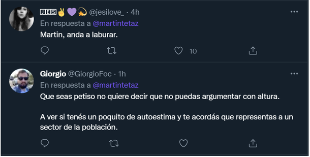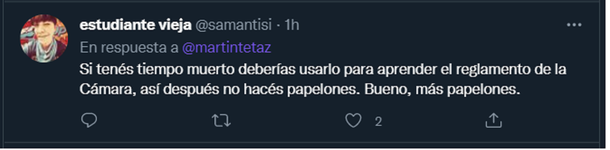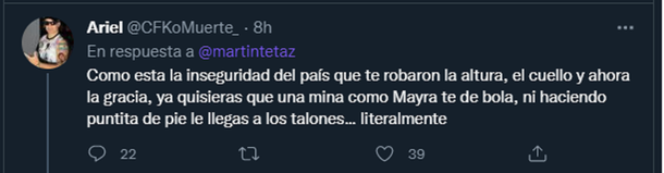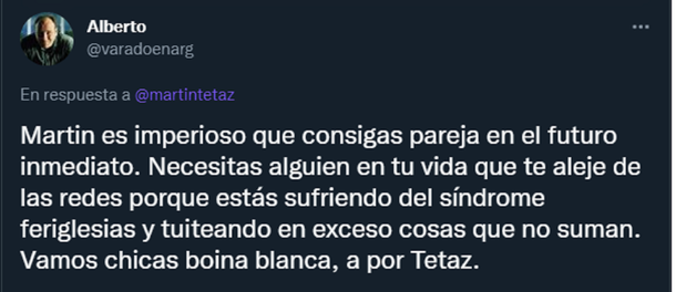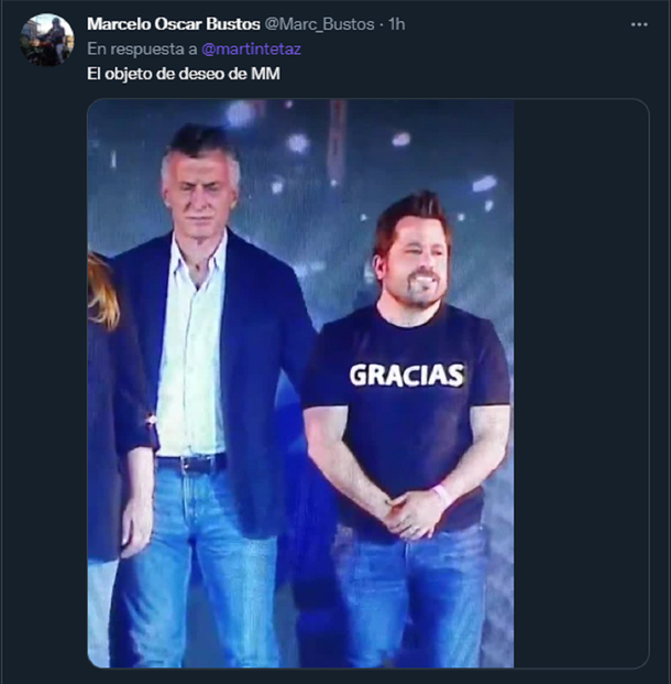 Fue por esta textual que Martín Tetaz salió a defender a su Mauricio Macri con un tuit machista que fue blanco de bromas y repudio generalizado. "Ustedes que piensan del machirulo de la derecha? Tendrá como objeto de deseo a Mayra (RT) o a Juliana (FAV)?...y le doy el changüí de poner el RT a favor de la Quilmeña", escribió el diputado de Juntos por el Cambio, junto a una foto de Mayra Mendoza y una de Juliana Awada.