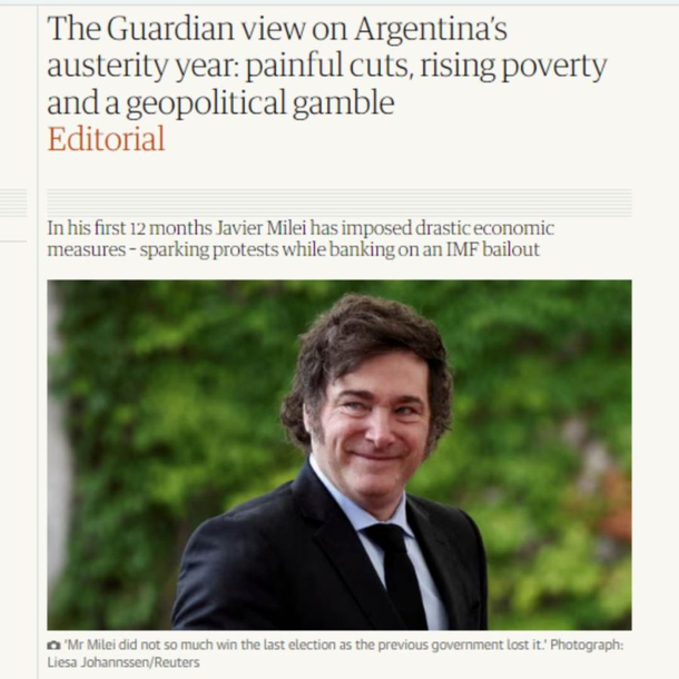 En el texto, The Guardian planteó que Milei no ganó tanto las elecciones de 2023 sino que las perdió el gobierno anterior. De este modo, argumentó que con un escenario de una inflación mensual del 8%, el hartazgo de los votantes con los partidos tradicionales y la incertidumbre sobre el futuro, Milei fue capaz de capitalizar el descontento de la ciudadanía.