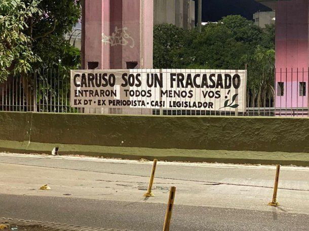 “Caruso sos un fracasado. Entraron todos menos vos. Ex DT, ex periodista, casi legislador”, fue el contundente mensaje que apareció en las inmediaciones del canal Todos Noticias, donde Caruso Lombardi es columnista deportivo los fines de semana.