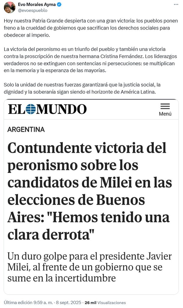 En la misma línea, Evo aseguró que "hoy nuestra Patria Grande despierta con una gran victoria: los pueblos ponen freno a la crueldad de gobiernos que sacrifican los derechos sociales para obedecer al imperio. La victoria del peronismo es un triunfo del pueblo y también una victoria contra la proscripción de nuestra hermana Cristina Fernández".