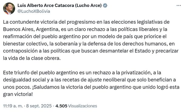 Y siguió "Este triunfo del pueblo argentino es un rechazo a la privatización, a la desigualdad social y a las recetas de ajuste neoliberal que solo benefician a unos pocos. ¡Saludamos la victoria del pueblo argentino que unido logró esta gran victoria!".