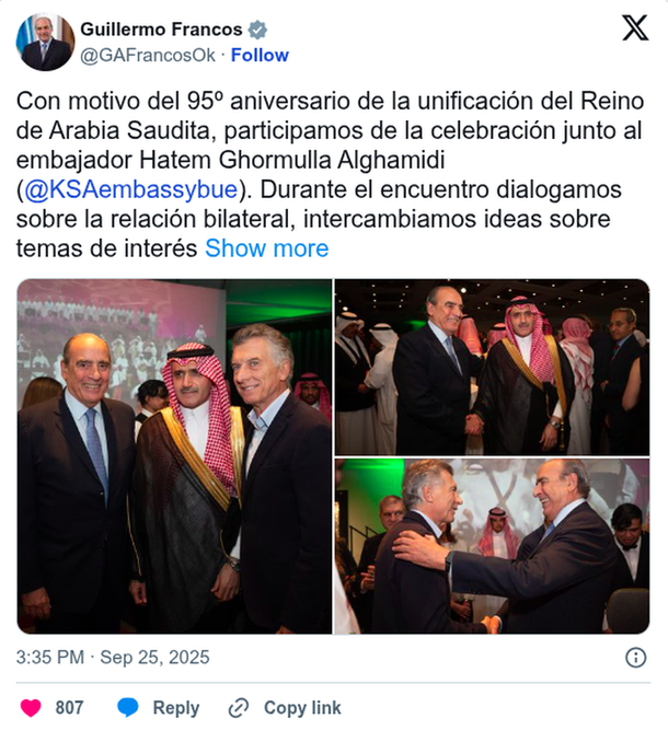 El jefe de Gabinete, Guillermo Francos, coincidió este jueves al mediodía con Mauricio Macri en un evento diplomático celebrado en la embajada de Arabia Saudita, en Palermo, y no perdió la oportunidad de saludarlo y de publicar el momento en redes sociales.