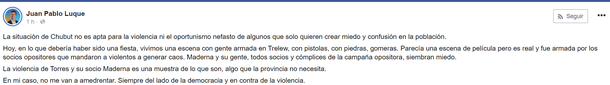 El candidato a gobernador por Arriba Chubut, Juan Pablo Luque, junto a su compañero Ricardo Sastre, denunciaron el gravísimo hecho de violencia sufrido en el barrio Planta de Gas de Trelew, mientras se desarrollaba una caminata con vecinos en el marco de la campaña. Allí un grupo violento “reconocidos militantes de Maderna y Torres, nos atacaron con armas de fuego, cuchillos y piedras, desatando el miedo y el caos que por un milagro no terminó en una tragedia”.