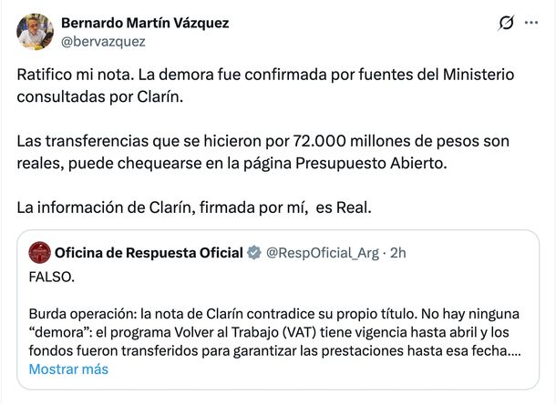 Sin embargo, el periodista Bernardo Martín Vázquez, quien firmó la nota, también desmintió a la Oficina. "Ratifico mi nota. La demora fue confirmada por fuentes del Ministerio consultadas por Clarín. Las transferencias que se hicieron por 72.000 millones de pesos son reales, puede chequearse en la página Presupuesto Abierto. La información de Clarín, firmada por mí, es Real", sentenció.