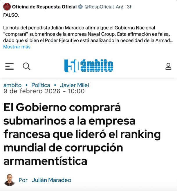 La Oficina de Juan Doe fue contundente, incluso en contra de lo que dijo el Jefe de Estado. "La nota del periodista Julián Maradeo afirma que el Gobierno Nacional 'comprará' submarinos de la empresa Naval Group. Esta afirmación es falsa, dado que si bien el Poder Ejecutivo está analizando la necesidad de la Armada Argentina de adquirir submarinos, no existe ningún contrato ni hay ninguna compra en curso actualmente", señaló.