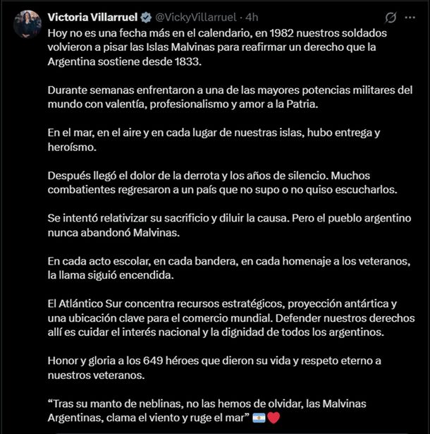 Desde su cuenta de X, la vicepresidenta sostuvo que "no es una fecha más en el calendario" y recordó que en 1982 "los soldados volvieron a pisar las Islas Malvinas para reafirmar un derecho que la Argentina sostiene desde 1833". En ese sentido, destacó que durante el conflicto enfrentaron "a una de las mayores potencias militares del mundo con valentía, profesionalismo y amor a la Patria".
