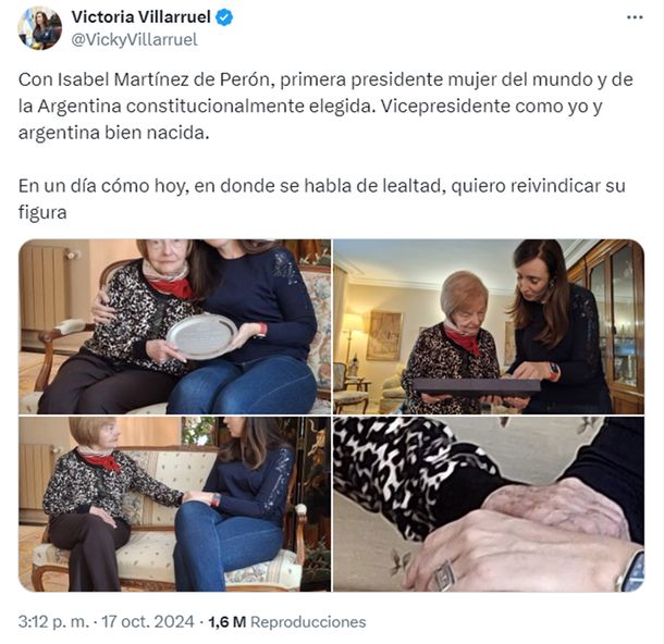 Villarruel acompañó las imágenes con el siguiente texto: “Con Isabel Martínez de Perón, primera presidente mujer del mundo y de la Argentina constitucionalmente elegida. Vicepresidente como yo y argentina bien nacida”.