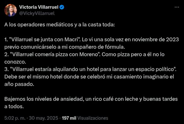 "1. 'Villarruel se junta con Macri'. Lo vi una sola vez, en noviembre de 2023, previo comunicárselo a mi compañero de fórmula", enumeró Victoria Villarruel en alusión a su pacto electoral con Javier Milei.