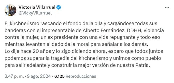 "El kirchnerismo rascando el fondo de la olla y cargándose todas sus banderas con el impresentable de Alberto Fernández. DDHH, violencia contra la mujer, un ex presidente con una vida repugnante y todo eso mientras levantan el dedo de la moral para señalar a los demás", criticó Villarruel a través de su cuenta en la red social X.