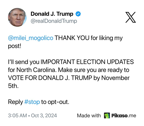"@milei_mogolico GRACIAS por darle me gusta a mi publicación! Te enviaré ACTUALIZACIONES IMPORTANTES SOBRE LAS ELECCIONES en Carolina del Norte. Asegúrate de estar listo para VOTAR POR DONALD J. TRUMP antes del 5 de noviembre. Responder #stop para darse de baja", dice la publicación de @realDonaldTrump que no tardó en volverse viral y generar memes.