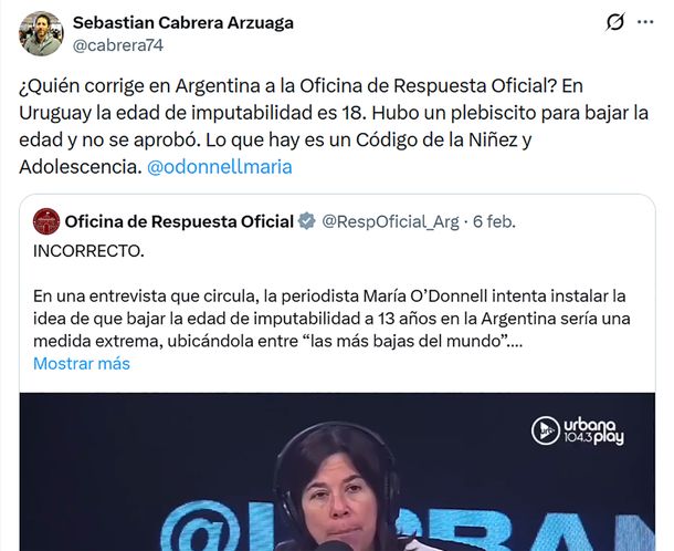 “¿Quién corrige en Argentina a la Oficina de Respuesta Oficial? En Uruguay la edad de imputabilidad es 18. Hubo un plebiscito para bajar la edad y no se aprobó. Lo que hay es un Código de la Niñez y Adolescencia”, precisa el periodista oriental Sebastián Cabrera Arzuaga.