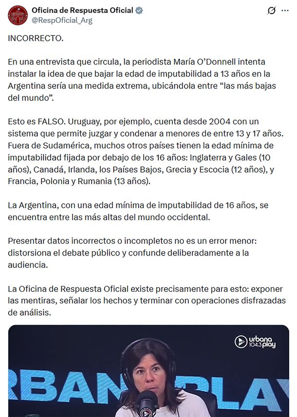 “En una entrevista que circula, la periodista María O’Donnell intenta instalar la idea de que bajar la edad de imputabilidad a 13 años en la Argentina sería una medida extrema, ubicándola entre ‘las más bajas del mundo’”, comienza la publicación de la Oficina de Respuesta Oficial acompañada de las imágenes de la mencionada comunicadora.