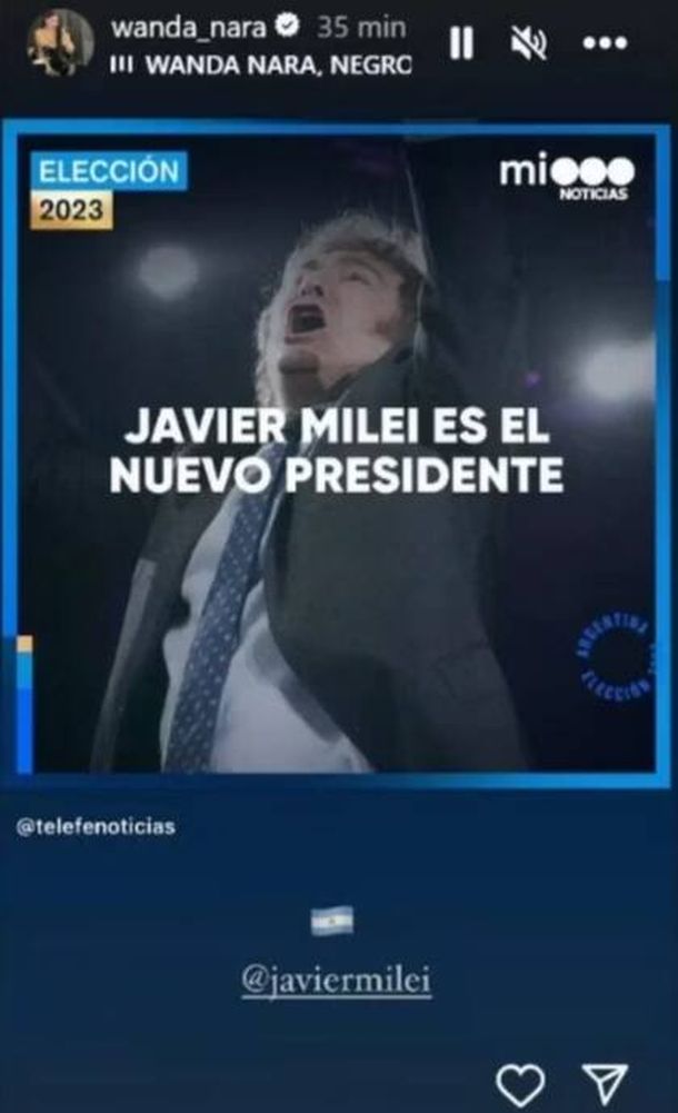 Javier Milei fue el ganador del ballotage presidencial del último domingo, venciendo al candidato oficialista Sergio Massa. La victoria del libertario generó todo tipo de reacciones en la farándula argentina. Siguiendo esta línea, Wanda Nara realizó un llamativo posteo en las historias de su Instagram, publicación que luego terminó eliminando.