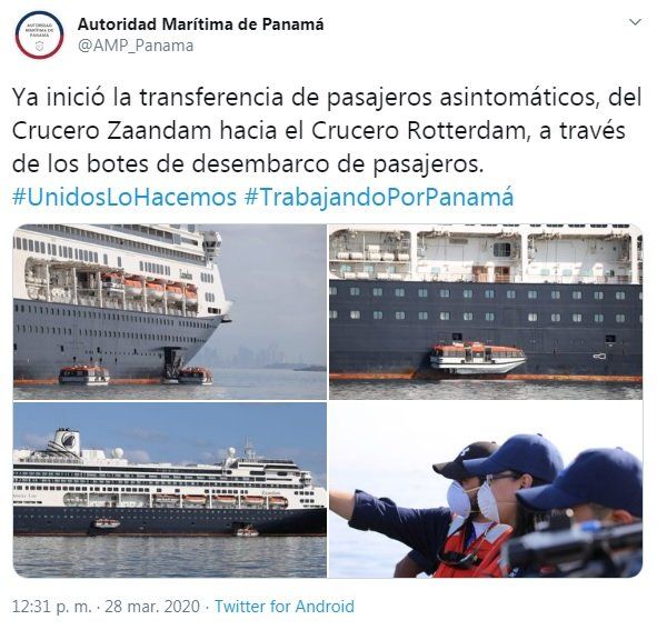 A través de un comunicado, la Autoridad Marítima de Panamá (AMP), informóla transferencia de 401 pasajeros asintomáticos del crucero Zaandam al buque Rotterdam a través botes tipo “tenders” y que el próximo destino para estos dos buques será el puerto de Fort Lauderdale, en los Estados Unidos.