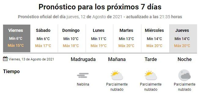 Para este viernes, el SMN prevé una mínima de 6 grados, una máxima de 15 y cielo parcialmente nublado, con neblina por la madrugada.