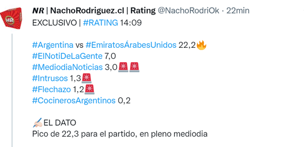 Y cuando se acercaba la recta final del partido llegó a los 22 puntos de rating. Sumados todos los canales apenas llegaban a la mitad que medía la Selección