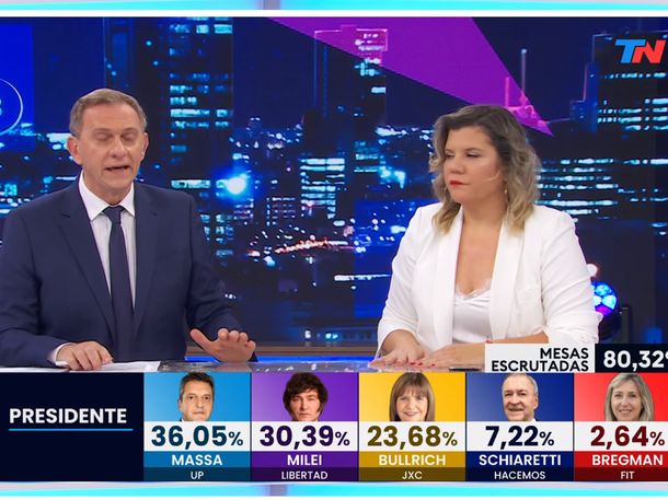 En TN todo era dolor, al punto que fueron los primeros en confirmar que Patricia Bullrich quedaba fuera del balotaje, los datos llegaban, según informaban, desde Juntos por el Cambio.