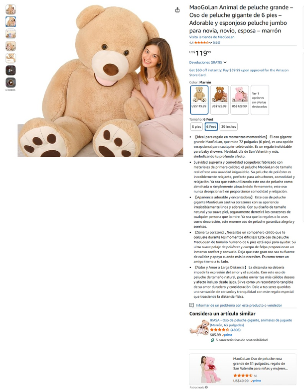 El imponente muñeco de felpa marrón claro captó rápidamente la atención de los usuarios. Se trata de un modelo de dimensiones impresionantes: según las especificaciones de artículos similares en tiendas de e-commerce, como el comercializado por la marca MaoGoLan, este tipo de osos gigantes alcanzan los 6 pies de altura, es decir, unos 1,82 metros (72 pulgadas).