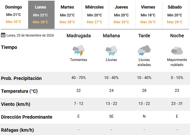 El inicio de semana también estará marcado por las precipitaciones. Además, habrá un notorio descenso en la temperatura máxima: este lunes el termómetro podría alcanzar hasta los 28 grados, siendo la mínima de 22.