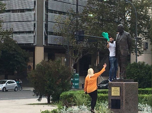 La intervención sobre las estatuas, que no sufrieron daños, fue realizada por unas veinte integrantes del Frente de Mujeres para la Victoria, quienes divididas en cinco autos trabajaron durante la madrugada en la iniciativa.