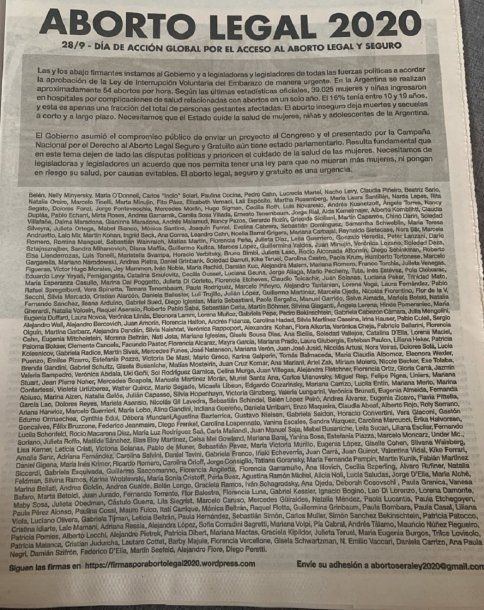 El texto, publicado este domingo en los diarios Tiempo Argentino y Perfil, insta "al Gobierno y a legisladoras y legisladores de todas las fuerzas políticas a acordar la aprobación de la Ley de Interrupción Voluntaria del Embarazo de manera urgente".