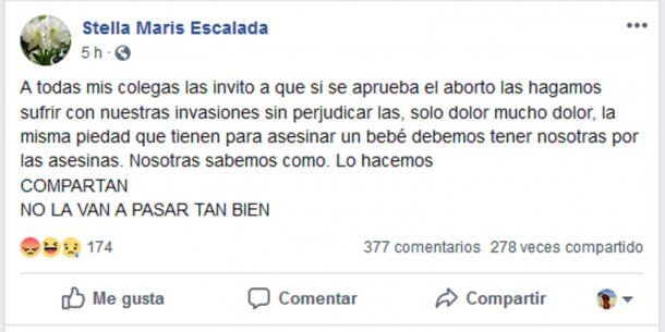 La polémica enfermera Stella Maris Escalada realizó un polémico posteo en su cuenta de Facebook: “A todas mis colegas las invito a que si se aprueba el aborto las hagamos sufrir con nuestras invasiones sin perjudicarlas, solo dolor mucho dolor, la misma piedad que tienen para asesinar un bebé debemos tener nosotras por las asesinas. Nosotras sabemos cómo. Lo hacemos.”