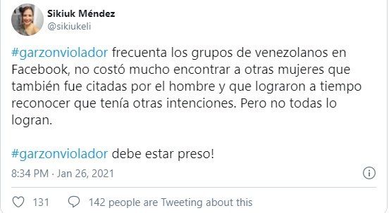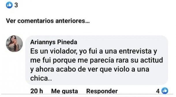 “Es un violador, yo fui a una entrevista y me fui porque me parecía rara su actitud y ahora acabo de ver que violó a una chica”, señaló la usuaria.