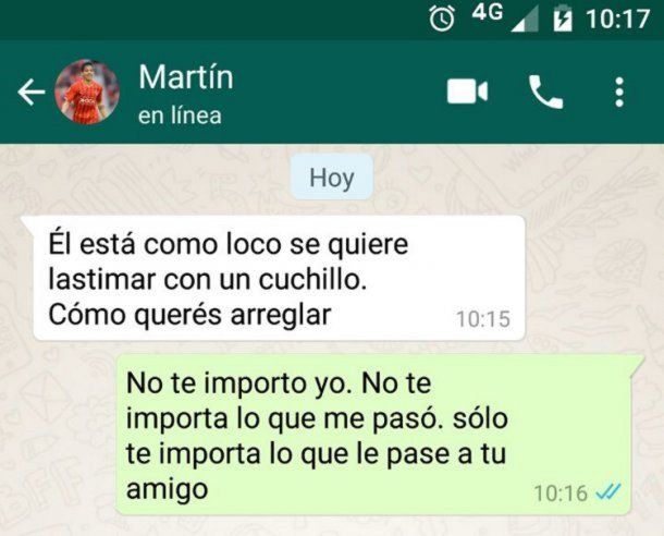 En el primer mensaje, Benítez le escribe a su novia: lo primero que le inquieta es saber si ya realizó la denuncia. Ella le reclama que diga la verdad y no cubra a Zárate.