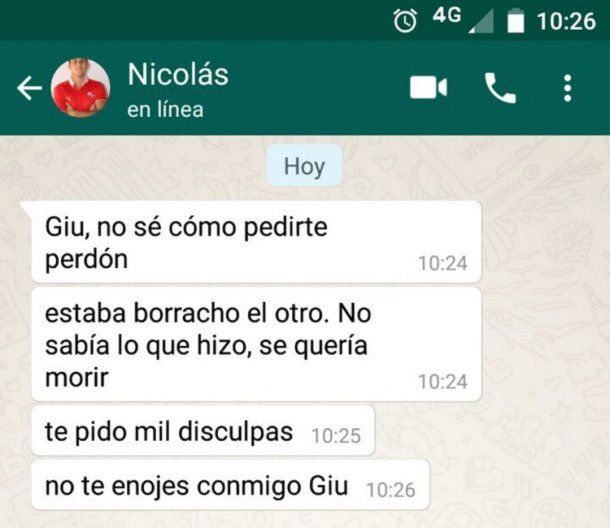 El que también escribió a la víctima fue Nicolás Pérez, dueño del departamento donde fue violada la joven. Pide “perdón” y justifica a Alexis Zárate diciendo que estaba borracho.