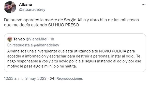 Tras su denuncia pública, le llegó un nuevo mensaje amenazante de la madre de Alila: “Albana sos una sinvergüenza que estás utilizando a tu novio policía para acceder a información y escrachar para destruir a personas, instar al odio... Te hago responsable a vos y a tu novio policía si seguís instando al odio y por ese motivo le pasa algo a mi hijo o mi nietita”, dice el mensaje de Twitter.