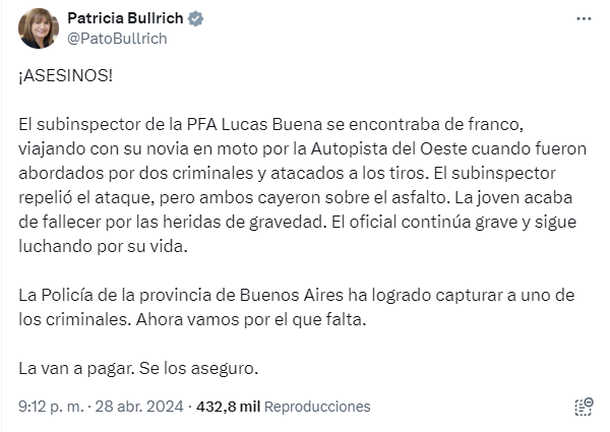 “¡Asesinos! El subinspector de la PFA Lucas Buena se encontraba de franco, viajando con su novia en moto por la Autopista del Oeste cuando fueron abordados por dos criminales y atacados a los tiros. El subinspector repelió el ataque, pero ambos cayeron sobre el asfalto. La joven acaba de fallecer por las heridas de gravedad. El oficial continúa grave y sigue luchando por su vida. La Policía de la provincia de Buenos Aires ha logrado capturar a uno de los criminales. Ahora vamos por el que falta”.