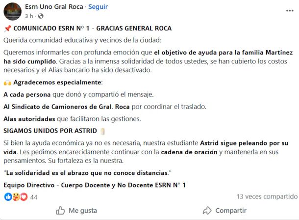 Horas más tarde, la ESRN Nº1 publicó un segundo comunicado con una noticia que llevó algo de alivio en medio de la conmoción. Según informaron, el objetivo económico fue alcanzado, ya que las donaciones recibidas permitieron cubrir los costos necesarios.