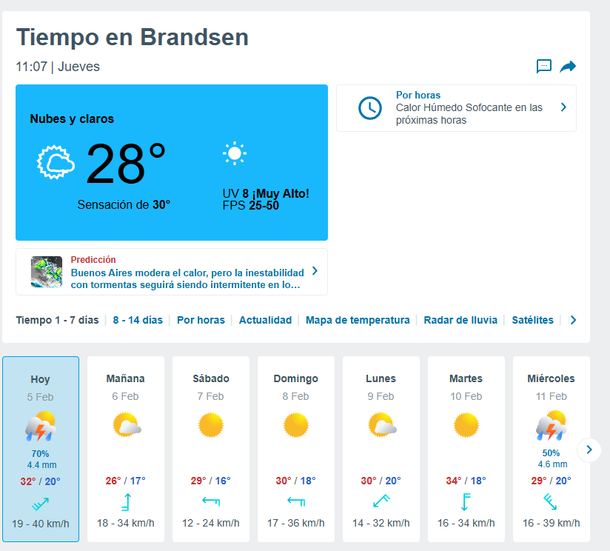 20:00 hs: Rota el viento al Sur. Las ráfagas del sector sur limpiarán el aire y la temperatura bajará a 28°C.