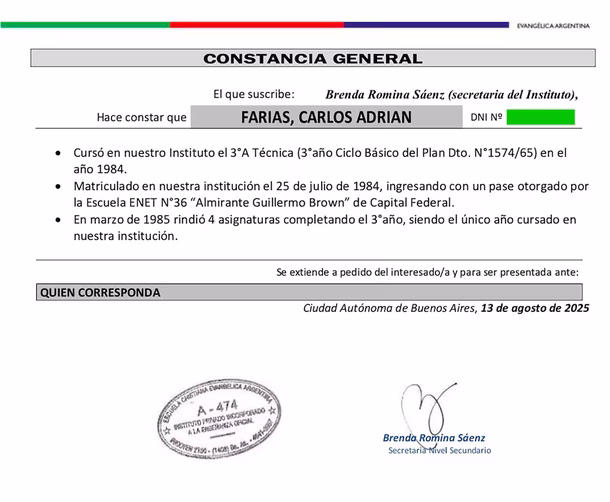 Este miércoles, el propio Farías compartió el certificado otorgado - según se lee en el sello - por la Escuela Cristiana Evangélica Argentina, con la firma de Brenda Romina Sáenz, secretaria del nivel secundario del instituto, y que lleva la fecha de hoy, 13 de agosto.