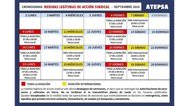 La Asociación de Pilotos de Líneas Aéreas (APLA) anunció un paro de actividades que afectará los vuelos de Aerolíneas Argentinas este viernes 6 de septiembre. La medida de fuerza tendrá lugar entre las 5 y las 14 horas, y afectará tanto el Aeroparque Metropolitano Jorge Newbery como el Aeropuerto Internacional de Ezeiza.