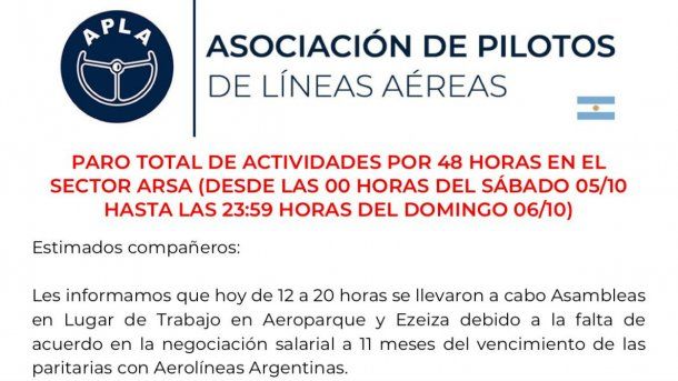 Los pilotos de Aerolíneas Argentinas y Austral anunciaron este lunes un paro total de 48 horas que comenzará a las 0 del sábado 5 de octubre y finalizará a las 0 del lunes 7 en reclamo de la apertura de paritarias.
