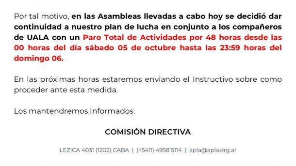 La medida de fuerza fue anunciada por APLA, el gremio mayoritario de los pilotos de Aerolíneas Argentinas, pero "en conjunto con los compañeros de UALA", es decir que los pilotos de Austral también van a adherir.