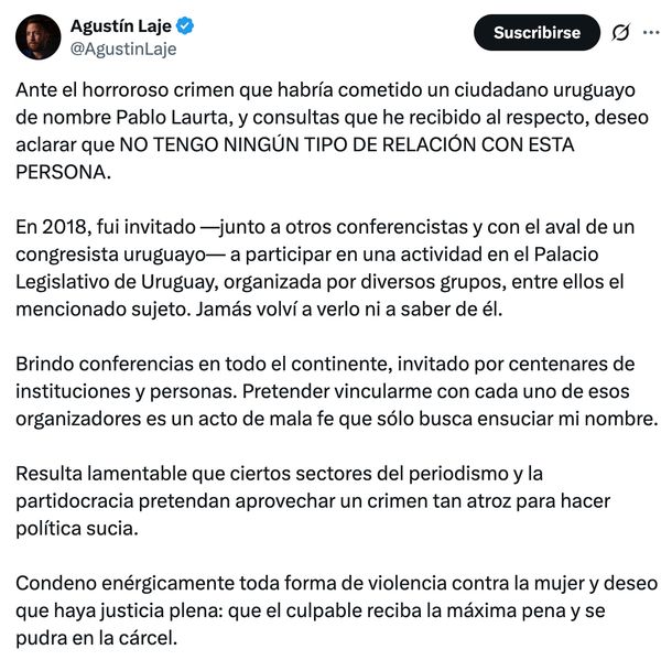 A pesar de estas imágenes, Laje difundió un comunicado para despejarse de Laurto, condenar el "horroroso crimen" y victimizarse, ya que sostuvo que los trascendidos de estos presuntos vínculos buscan "ensuciar" su nombre.