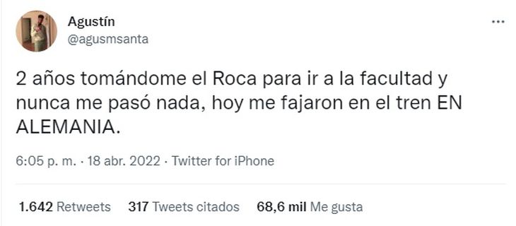 “Dos años tomándome el Roca para ir a la facultad y nunca me pasó nada. Hoy me fajaron en el tren en Alemania”, escribió Agustín Santamarina en su cuenta de Twitter.