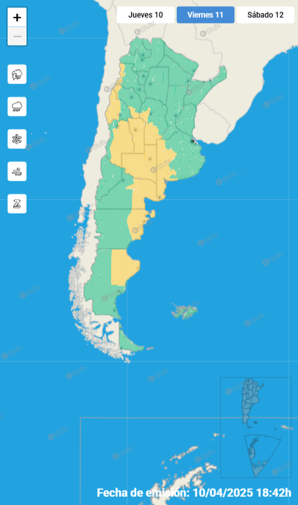 Este viernes 11 de abril de 2025 estará complicado en varias provincias, que están bajo alerta amarilla por lluvias y tormentas fuertes, con posible caída de granizo, según informó el Servicio Meteorológico Nacional (SMN).