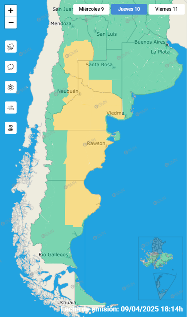 Las provincias que están bajo alerta amarilla este jueves por tormentas y posible caída de granizo son Santa Cruz, Chubut, Río Negro, Neuquén, La Pampa y Mendoza.