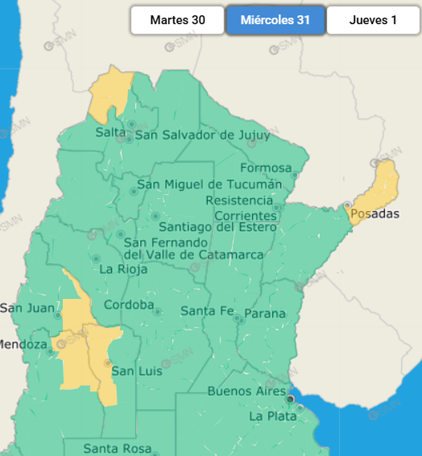 Los territorios del país que estarán afectados por la alerta amarilla son Salta, Misiones, San Juan, San Luis y Mendoza.