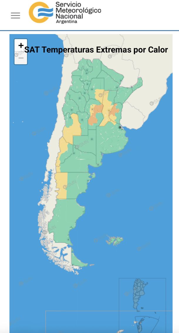 A su vez, publicó una alerta amarilla por calor extremo, la cual regirá en Córdoba, Entre Ríos, Santa Fe, Santiago del Estero, Mendoza, Río Negro, Neuquén y Chubut. Estas temperaturas pueden ser “peligrosas”, sobre todo para los grupos de riesgo, como niños y niñas, personas mayores de 65 años, con enfermedades crónicas" y podrían genera un efecto leve a moderado en la salud.