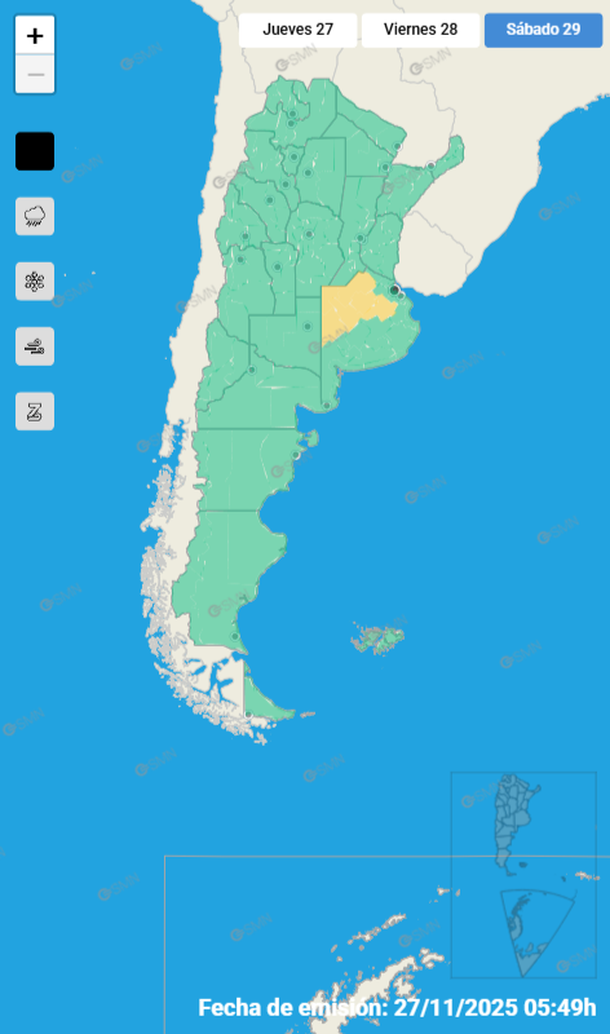 El Servicio Meteorológico Nacional (SMN) emitió una alerta amarilla por tormentas fuertes para este jueves que abarca la zona centro, este y oeste del país, afectando a siete provincias. Se estima que el fenómeno se prolongará hasta la mañana del domingo.