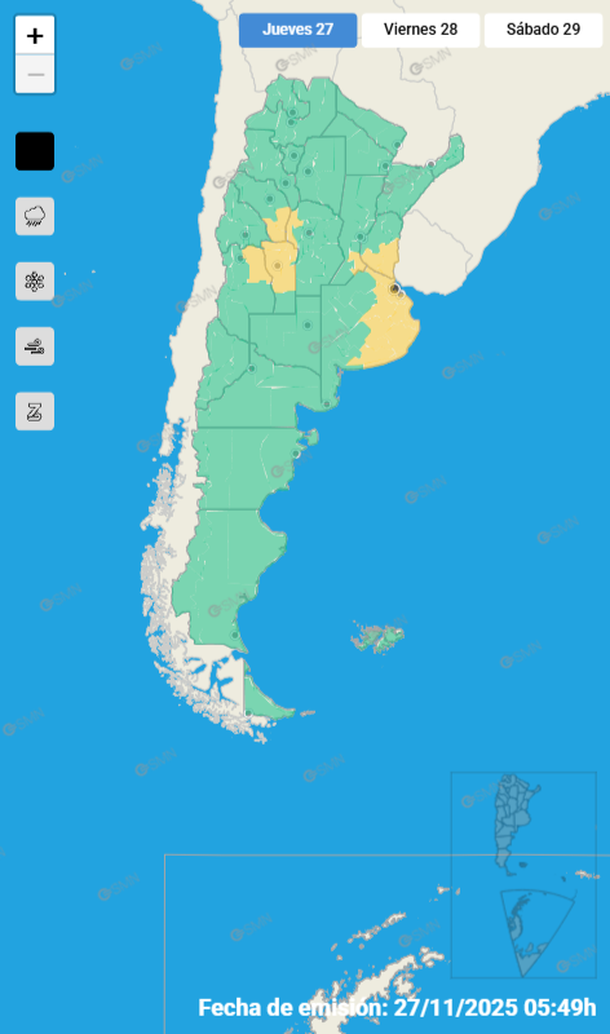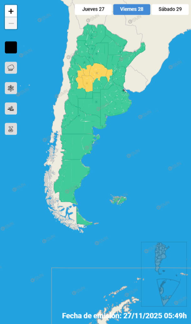 En este sentido, para el viernes rige un alerta amarillo que se mantendrá en las provincias cuyanas antes mencionadas, con la particularidad que durante este día podrían afectar también a todo el centro y norte de la provincia de Córdoba y parte del centro y oeste de Santa Fe.